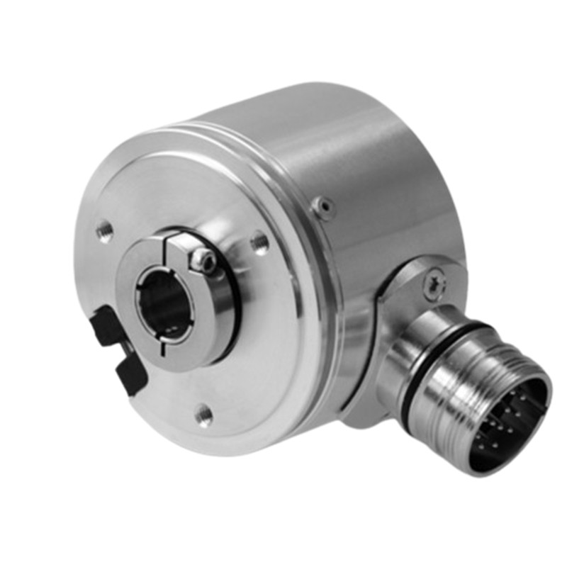 Codeur incrémental programmable, Ø58 mm à axe creux traversant, alésage Ø12 mm, IP65, bague de serrage, résolution 320000 imp/tour, sorties Totem pôle AB0, alimentation 10-30 VDC, embase radiale mâle M23 à 12 contacts en sens anti-horaire, série BHG - HighRes