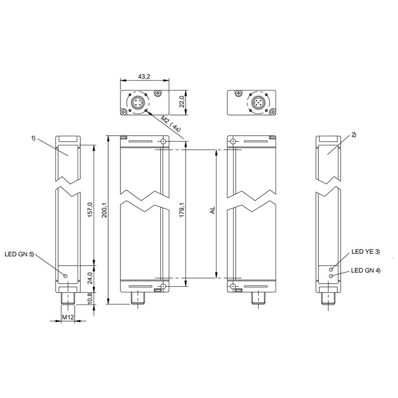 Réseau optique, Série: 1-015, Dimensions: 22 x 200,1 x 43,2 mm, Longueur active AL 1: 150 mm, Interface: Analogique, tension 0…10 V PNP Contact à fermeture (NO), Principe de fonctionnement: Réseau optique, Principe de fonctionnement optique: Barrage optique unidirectionnel, Caractéristique faisceau: divergent, Type de lumière: Infrarouge, Portée: 0...2,1 m, Plus petite pièce typ.: 7,0 avec t 0,5 x Sn, R0: 2,1 m, Raccordement: Connecteur, connecteur mâle M12x1, Matériau du boîtier: Aluminium, anodisé, Face sensible, matériau: PMMA, Tension d'emploi Ub: 20...28 VDC, Homologation / conformité: CE, UKCA, WEEE