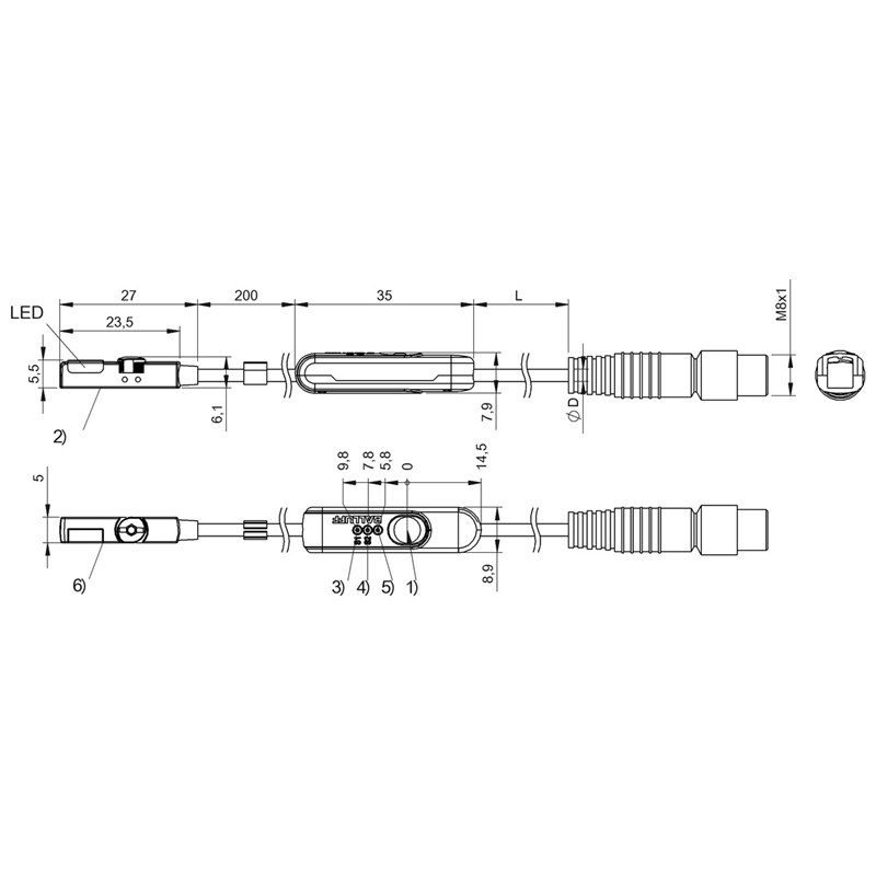 Capteur de proximité magnétique; Utilisation: Vérin pneumatique avec rainure en T; Fonction d'apprentissage : 2 points d'action; Sortie de communication: PNP; Type de commutation: Contact à fermeture (NO); Fixation: Insérable par le haut dans la rainure en T; Raccordement: Câble avec connecteur mâle M8, 4 pôles, 0,.3 m, PUR; Tension d'emploi Ub: 10-30Vdc; Dimensions: 23,5 x 6,2 x 5 mm; Matériau boîtier PA 12; Degré de protection: IP67; Température ambiante: -25...80 °C ; Homologation / conformité: CE, UKCA, cULus, WEEE