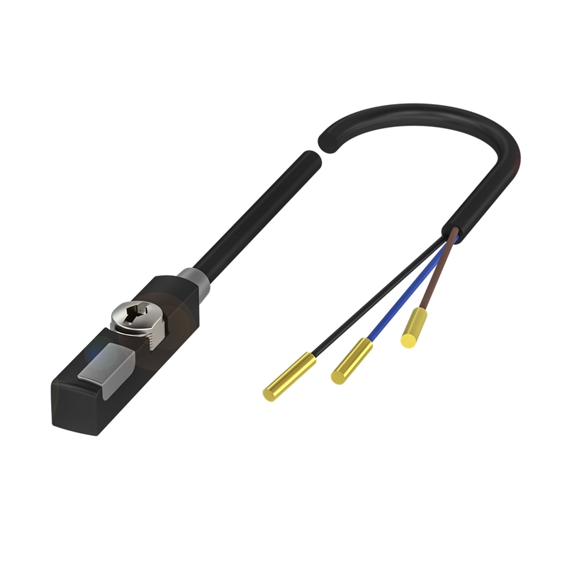 Capteur magnétique, Forme de rainure: Rainure en T, Dimensions: 23,5 x 5 x 5,5 mm, Principe de fonctionnement: Capteur magnétique, Câble: TPU, 1 m, Utilisation: Vérin pneumatique avec rainure en T. Dimensions, voir croquis dans la vue du produit., Fixation: insérable par le haut dans la rainure en T, Matériau du boîtier: PA 12, Sortie de commutation: PNP à fermeture (NO), Fréquence de commutation: 3000 Hz, Tension d'emploi Ub: 10...30 VDC, Température ambiante: 25...85 °C, Classe de protection: IP67, Homologation / conformité: cULus, CE, UKCA, WEEE
