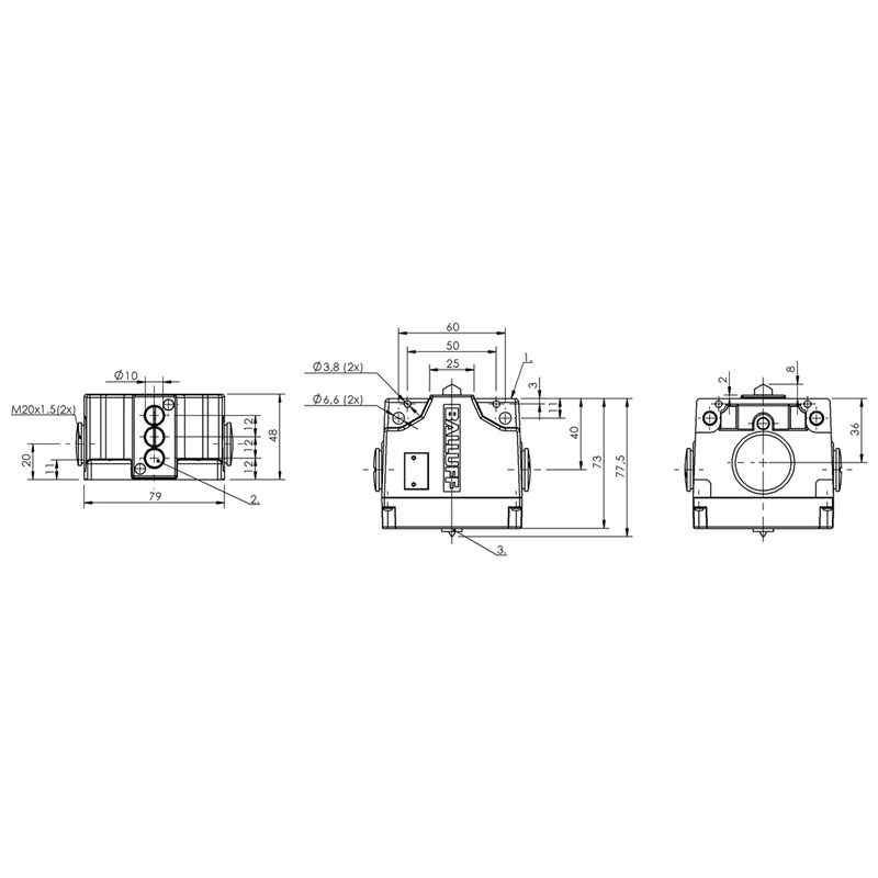 Interrupteur de position mécanique; Modèle: 61; Version: Contact à ressort; Nombre d'éléments de sortie: 3x Toit; Entraxe entre contacts: 12 mm; Principe actif: (1). inductif, (2-3). mécanique; Portée: 2 mm; Courant permanent: (1). 0.2 A, (2-3). 6 A; Tension d'emploi nominale Ue: (1) 24 V DC; Montage: Vertical; Direction d’approche: Dans l'axe longitudinal, parallèle à la surface de vissage; Vitesse d'approche: (2-3): 40 m/min; Type de raccordement: (1-3) Borne à vis; Dimensions: 79 x 48 x 77,5 mm; Matériau du boîtier: Aluminium, anodisé; Classe de protection: IP67; Température ambiante: -5...70 °C; Homologation / conformité: CE, UKCA, WEEE; Série: 819