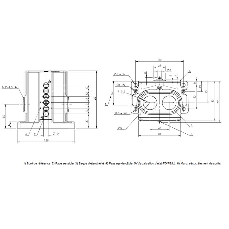 Interrupteur de position mécanique; Modèle: 100; Version: Sécurité DIN EN 60204-1; Nombre d'éléments de sortie: 6 ST; Entraxe entre contacts: 12 mm; Principe actif: 1.: Inductif, 2-6.: Mecanique; Portée: 2 mm; Courant permanent: (1).: 0.2 A, (2-6).: 6 A; Tension d'emploi nominale Ue: 1.: 24 V DC, 2-6.: 250 V AC; Montage: Vertical; Direction d’approche: Dans l'axe longitudinal, parallèle à la surface de vissage; Vitesse d'approche: (2-3).: 80 m/min, (4-6).: 120 m/min; Type de raccordement: (1-6).: Borne à vis; Dimensions: 120 x 120 x 87 mm; Matériau du boîtier: Aluminium, anodisé; Classe de protection: IP67; Température ambiante: -5...70 °C; Homologation / conformité: CE, WEEE