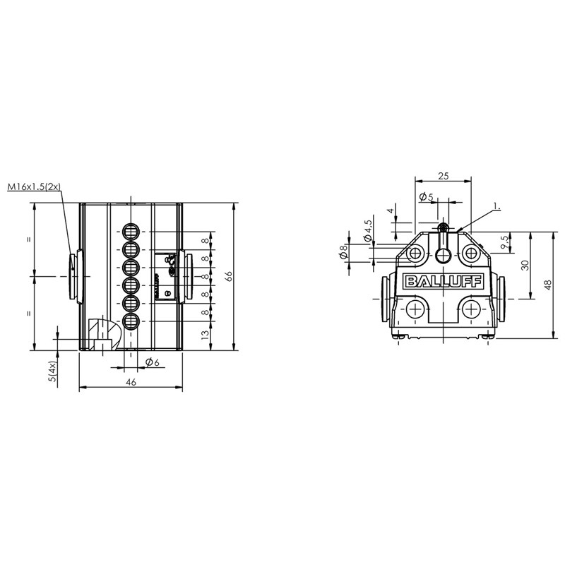 Interrupteur de position mécanique; Modèle: 40; Version: Contact à ressort; Nombre d'éléments de sortie: 6x galet; Entraxe entre contacts: 8 mm; Principe actif: (1-6): Mécanique; Courant permanent: (1-6): 5 A; Tension d'emploi nominale Ue: (1-6): 250 VAC; Montage: Vertical; Direction d’approche: Dans l'axe longitudinal, parallèle à la surface de vissage; Vitesse d'approche: (1-6): 60 m/min; Type de raccordement: (1-6): Connexion soudée; Dimensions: 40 x 66 x 48 mm; Matériau du boîtier: Aluminium, anodisé; Classe de protection: IP67; Température ambiante: -5...85 °C; Homologation / conformité: CE, CCC, WEEE