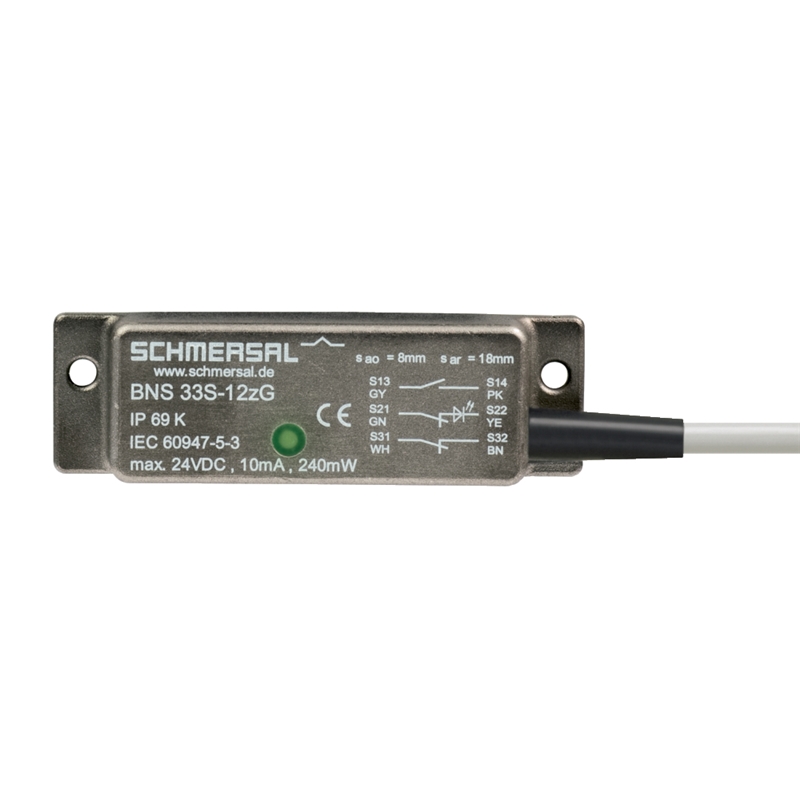 Capteur de sécurité magnétique; Version: Sans voyant lumineux LED; Nombre de contacts NF: 2; Nombre de contacts NO: 1; Raccordement: Câble 5 m, PVC; Dimensions: 88 mm x 27 mm x 14,5 mm; Matériau du boîtier: Acier inoxydable; Etanchéité: IP69K; Température ambiante: -25 °C ... +70 °C; Série: BNS 33