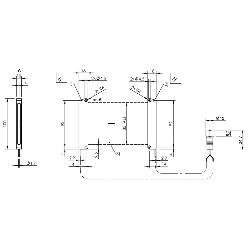 Micromote – Tête de capteur optique; Principe de fonctionnement: Tête de capteur optique; Principe de détection: Barrage ; Particularité optique: Bande lumineuse ; Portée: 10...500 mm; Source d'émission: LED, Lumière infrarouge; Longueur active AL 1: 80 mm ; Plus petite pièce typ.: 1,20 mm; Interface: Pour amplificateur-relais; Raccordement: Câble avec connecteur mâle M8x1, 3 pôles, 2,00 m, PUR; Dimensions: 18 x 10 x 100 mm; Matériau du boîtier: Aluminium, anodisé, noir ; Face sensible, matériau: PMMA ; Classe de protection: IP65; Température ambiante: -10 °C...55 °C; Amplificateur de référence: BAE SA-OH-059-…; Homologation / conformité: CE, UKCA, cULus, WEEE