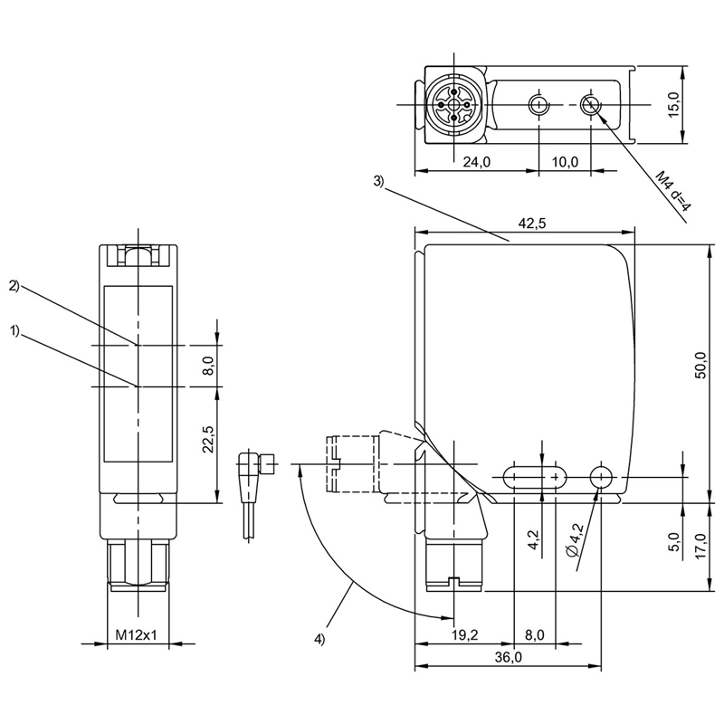 Capteur photoélectrique, Série: 21M, Dimensions: 15 x 50 x 42,5 mm, Interface: PNP Contact à fermeture (NO) PNP Contact à ouverture (NF), Principe de fonctionnement: Capteur photoélectrique, Principe de fonctionnement optique: Détecteur optique, énergétique, Caractéristique faisceau: collimaté, Type de lumière: Laser à lumière rouge, Portée: 0...600 mm, Raccordement: Connecteur, Connecteur M12x1, mâle, 4 pôles, Matériau du boîtier: Zinc, Coulé sous pression, revêtement par poudre Aluminium, Face sensible, matériau: PMMA, Tension d'emploi Ub: 10...30 VDC, Homologation / conformité: CE, UKCA, cULus, WEEE