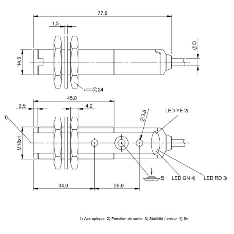 • Format: Cylindrique fileté avec méplat, M18x1, faisceau axial