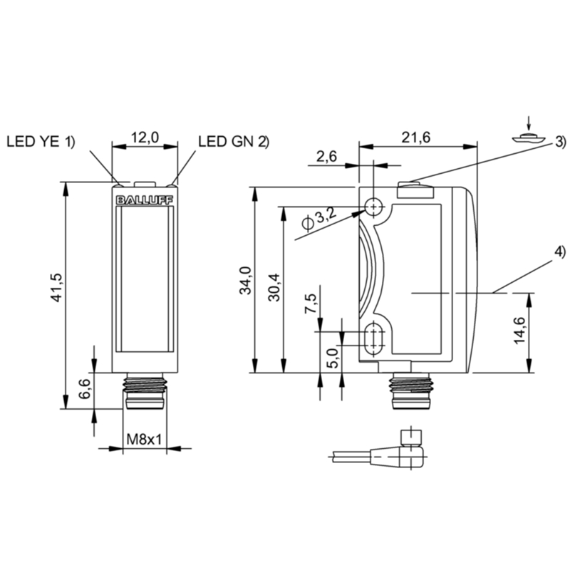 Capteur photoélectrique; Format: Parallélépipédique; Principe du capteur: Barrage optique à réflexion; Principe de fonctionnement: Barrage sur réflecteur, optique coaxiale, collimaté; Portée: 0…4 m; Réglage: Touche d'apprentissage; Source d'émission: Laser, Lumière rouge; Taille du spot lumineux: Ø 2 mm à 2,5 m; Sortie de commutation: PNP; Type de commutation: Contact à fermeture/ouverture (NO/NF); Mode de commutation: Commutation claire/sombre; Fréquence de commutation: 4000 Hz; Mode de raccordement: Connecteur mâle M8 4 pôles; Tension d'alimentation: 10-30 Vdc; Dimensions: 12 x 21.6 x 41.5 mm; Matériau du boîtier: ABS; Classe de protection IP67 (IEC 60529), IP69K (DIN 40050); Température ambiante: -20…60 °C; Homologation / conformité: CE, cULus, EAC, WEEE; Réflecteur de référence: BOS R-22; Série: 6K