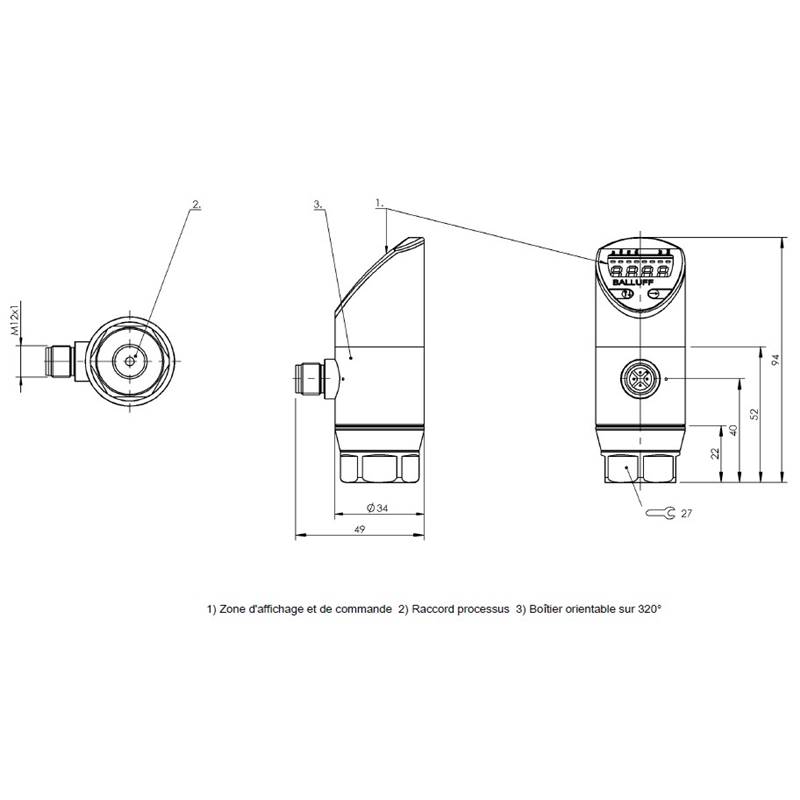 • Raccordement électrique: Connecteur mâle M12x1, 4 pôles