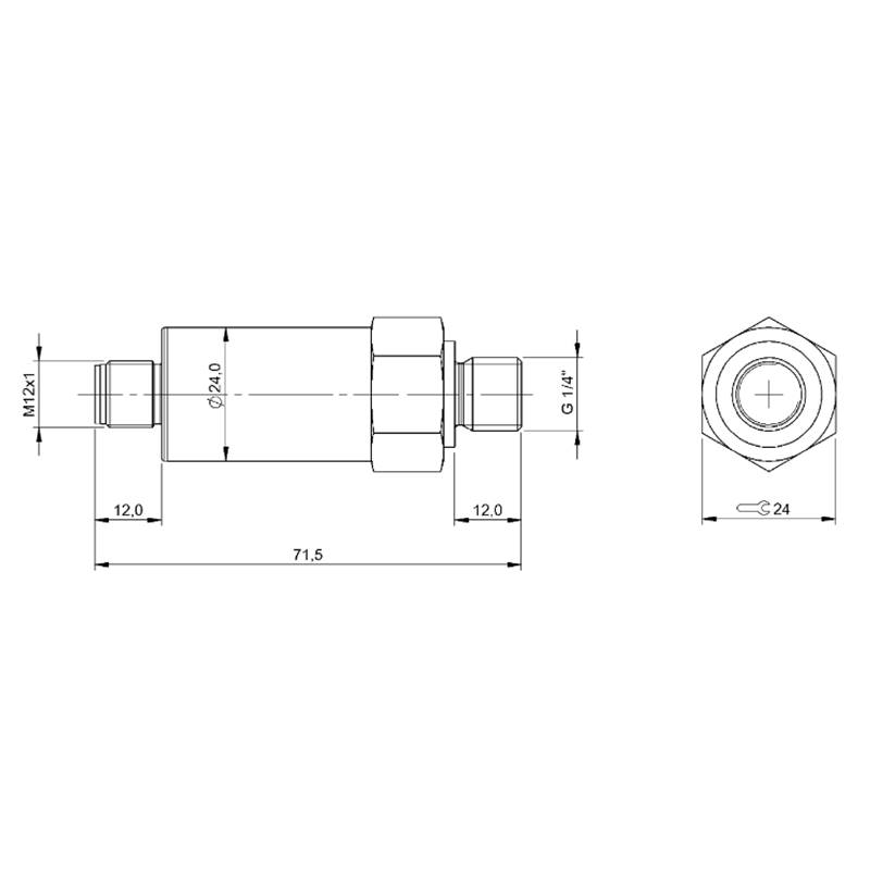 Capteur de pression sans afficheur; Plage de mesure: 0...10 bar; Précision: ±0,5 % P.E.SORT. BFSL; Pression de surcharge: 20 bar; Pression d'éclatement: 35 bar; Tension d'emploi Ub: 8...32 VDC; Sortie analogique: 4 .. 20 mA (2 fils); Raccordement: Connecteur mâle M12 x 1, 4 pôles; Matériau du raccord processus: Acier inoxydable 1.4301; Raccordement au processus: G 1/4" (DIN 3852); Matériau du raccord processus: Acier inoxydable (1.4301); Matériau de la bague d'étanchéité: FKM; Matériau du boîtier: Acier inoxydable (1.4301); Classe de protection: IP67; Température du produit: -40...125 °C; Température ambiante: -25...85 °C; Homologation / conformité: CE, cULus, EAC, WEEE