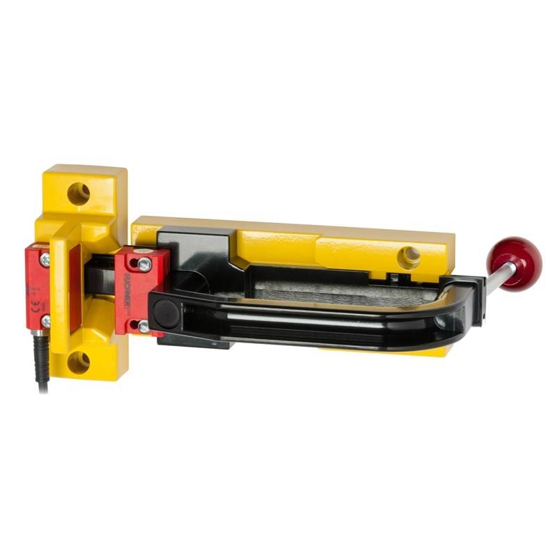Verrou-targette BTC-CES04-S-TH-21-F-123583 pour interrupteur de sécurité CES04; Verrouillage mécanique: Position fermée: ressort, Position ouverte: bouton d’arrêt; Jeu: 7 mm; Matériau: Aluminium; Version: Levier de déverrouillage interne, pour portes sur charnières à droite et à gauche, condamnation possible par cadenas en position ouverte