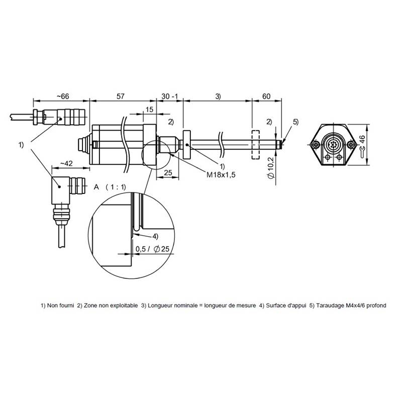 Capteur de déplacement Micropulse; Forme: Série à tige; Fixation: Bride filetée M18x1,5; Capteur de position, nombre max.: 4; Plage de mesure: 300 mm; Résolution: <= 2 µm; Ecart de linéarité max.: ±100 µm; Fidélité de répétition: 2 µm; Interface: Marche/arrêt; Marche/arrêt négatif; Raccordement: Connecteur, M16x0,75, 8-polaire; Tension d'alimentation: 20-28Vdc; Matériau du boîtier: Aluminium; Classe de protection: IP67; Température ambiante: -40...85 °C