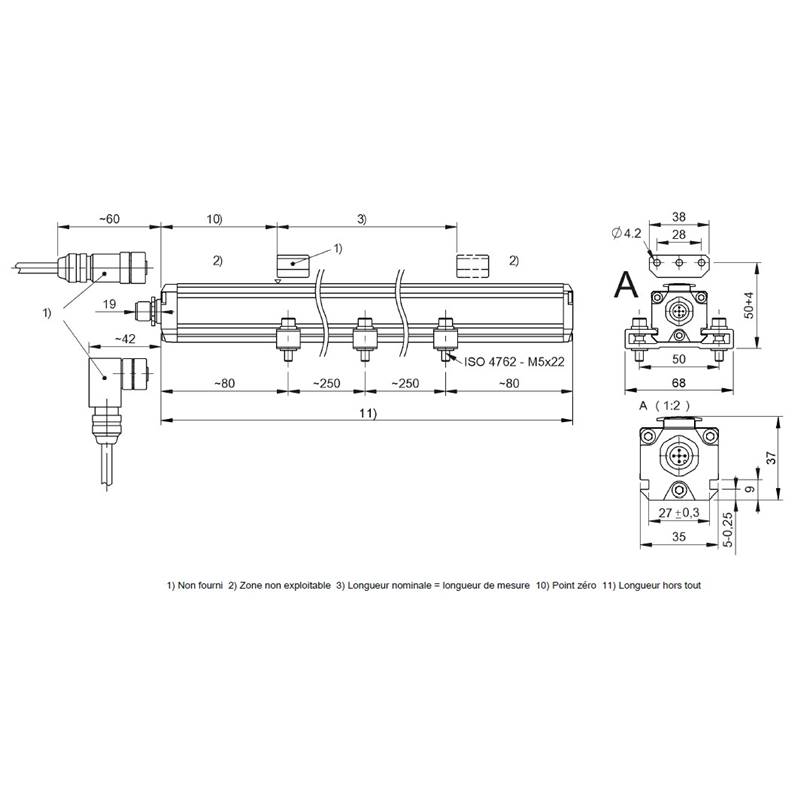 Capteur de déplacement Micropulse; Forme: Série Profil; Fixation: Brides de fixation; Plage de mesure: 350 mm; Résolution: <= 5 µm; Ecart de linéarité max.: ±30 µm; Fidélité de répétition: ± 1 LSB; Interface: CANopen DS301; Vitesse de transmission: 500 kbauds; Capteur de position, nombre max.: 4; Raccordement: Connecteur mâle M12 x 1, 5 pôles; Tension d'alimentation: 20-28Vdc; Matériau du boîtier: Aluminium; Classe de protection: IP67; Température ambiante: -40...85 °C
