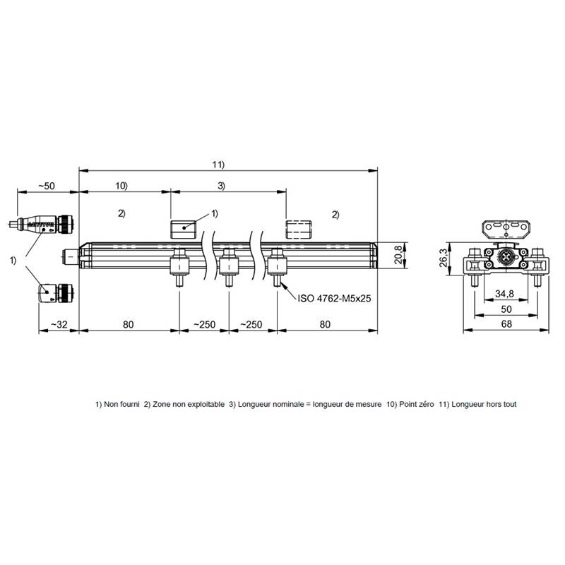 Système de mesure de position magnétostrictif profilé; Forme: Série Profil; Fixation: Brides de fixation; Matériau du boîtier: Aluminium, anodisé; Capteur de position, nombre max.: 1; Plage de mesure: 200 mm; Interface: IO-Link 1.1; Résolution: <= 5 µm; Ecart de linéarité max.: ±200 µm; Fidélité de répétition: <= 30 µm; Fréquence de mesure max.: 1000 Hz; Raccordement: Connecteur, M12 x 1, 4-polaire; Tension d'alimentation: 18-30Vdc; Température ambiante: -25...70 °C; Classe de protection: IP67; Homologation / conformité: CE, cULus, EAC, WEEE