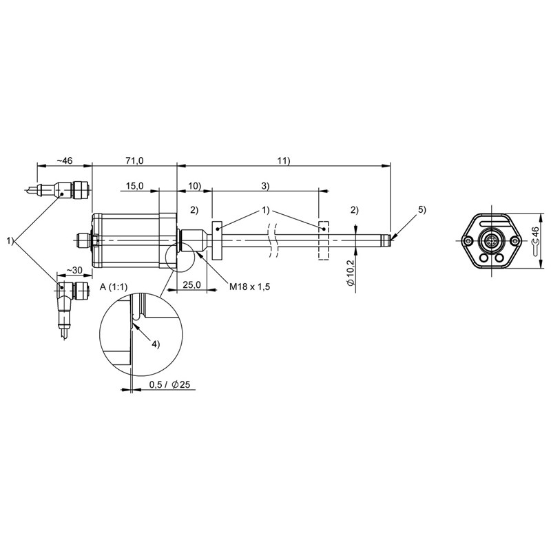 Système magnétostrictif, Forme: Série à tige, Fixation: Bride filetée M18x1,5, Matériau du boîtier: Aluminium, anodisé, Capteur de position, nombre max.: 1, Raccordement: Connecteur, M12x1, 8 pôles, Interface: EtherCAT ETG.1000.4, ETG.1000.6, Plage de mesure: 300 mm, Fréquence de mesure max.: 2000 Hz, Écart de linéarité max.: ±200 µm, Fidélité de répétition: = 30 µm, Tension d'emploi Ub: 20...28 VDC, Température ambiante: 0...70 °C, Classe de protection: IP67, Homologation / conformité: CE, UKCA, cULus, WEEE