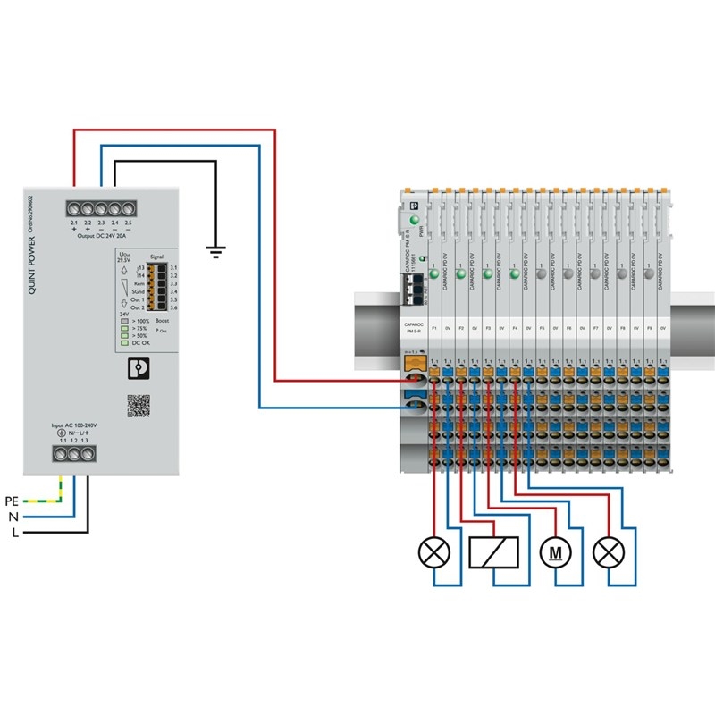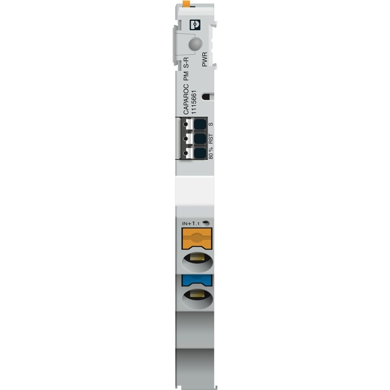 Module d'alimentation avec sortie d'état et entrée de réinitialisation pour l'alimentation du système de disjoncteur CAPAROC en 12 ou 24 V DC. Pour le montage sur rail DIN avec les barres collectrices CAPAROC.