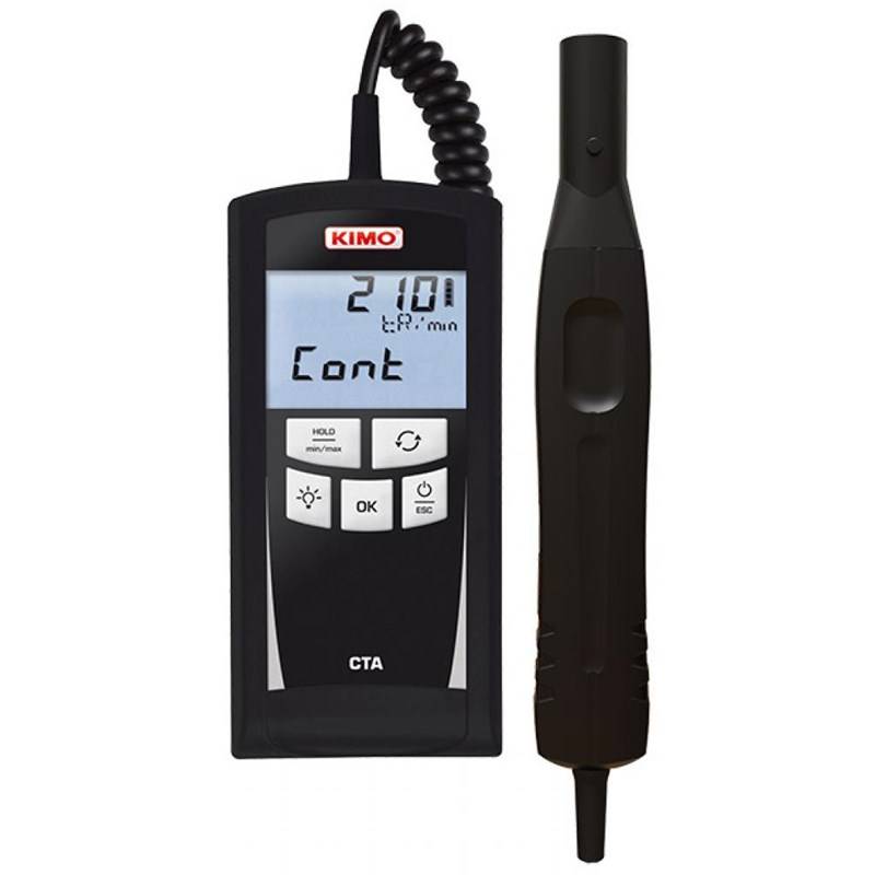 Tachymètre portable type CTA avec sonde optique et embout de contact avec câble longueur 2 m, (60 à 60 000 tr/min et 4 à 2500 m/min). Afficheur 2 lignes. Fonctions: Hold, Min, Max, rétro-éclairage et auto-extinction. Livré avec 1 m de ruban réfléchissant et certificat d'ajustage