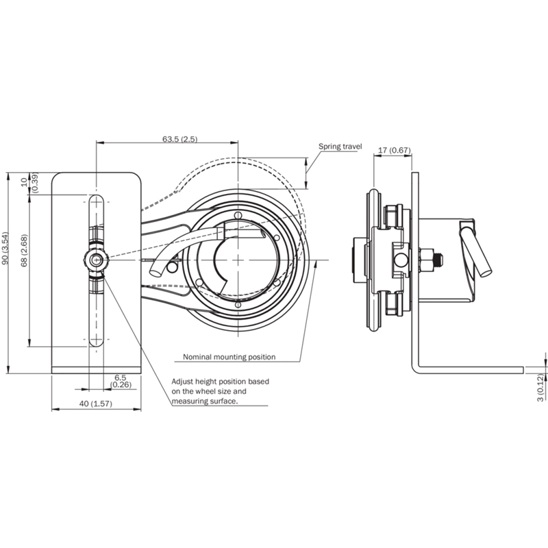 • Version bras à ressort: Bras à ressort de 63,5 mm, codeur côté montage, 1 roue mesureuse
