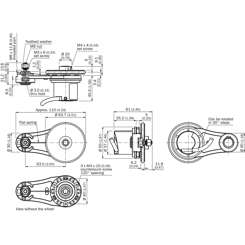 • Version bras à ressort: Bras à ressort de 63,5 mm, roue mesureuse côté montage, 1 roue mesureuse