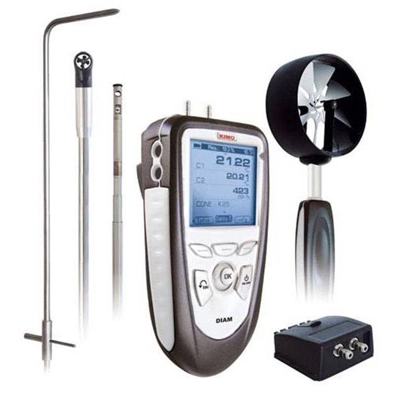 Micro-Anémomètre portable type DIAM-P avec afficheur graphique rétro-éclairé, module de pression (0 à 1000 mm CE - 4 à 100 m/s). Fonctions : Pression, Vitesse au tube de Pitot et sortie PC. Livré avec 2 x 1 m de tube silicone noir et blanc, tube inox Ø 6 mm longueur 100 mm, constat de vérification et mallette de transport. Options : Tubes de pitot, logiciel, module 4 voies thermocouple, sonde température TC, sondes fil chaud, sondes hélice Ø 14, 70 ou 100 mm et sonde %HR.