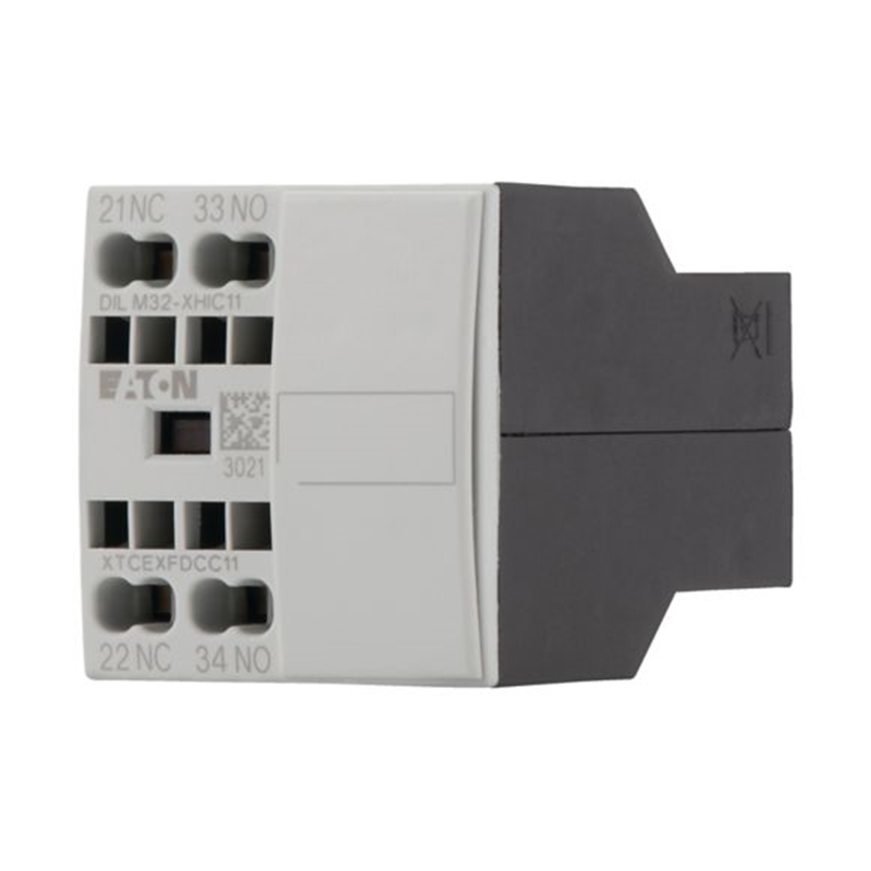 Module de contacts auxiliaires, avec éléments de contact mécaniquement liés, Fonctionnement: pour applications standards, 2 pôles, Raccordement: Bornes à ressort, Courant assigné d’emploi AC-15 220 V 230 V 240 V: Ie= 4 A, Courant assigné d’emploi AC-15 380 V 400 V 415 V: Ie= 4 A, Nombre de contacts F = contact à fermeture: 1 F, Nombre de contacts O = contact à ouverture: 1 O, Mode de montage: Fixation par l'avant, Utilisation avec: DILM(C)7-10..., DILM(C)9-10..., DILM(C)12-10..., DILM(C)15-10..., DILM(C)17-10..., DILM(C)25-10..., DILM(C)32-10..., DILM38-10..., DILMP20..., DILMP32-10..., DILMP45-10..., DILL…, DILMF8-10..., DILMF11-10..., DILMF14-10..., DILMF17-10..., DILMF25-10..., DILMF32-10..., Version: Contacts auxiliaires à montage frontal, Remarques: Eléments de contact mécaniquement liés selon IEC/EN 60947-5-1 Annexe L, dans les modules de contacts auxiliaires ainsi que dans les contacts auxiliaires intégrés des DILM 7 - DILM32, Contact auxiliaire à ouverture (non à ouverture retardée) utilisable comme contact miroir selon IEC/EN 60947-4-1 Annexe F