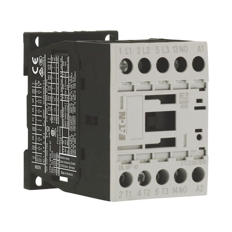 Contacteur de puissance, Application: Contacteur de puissance pour moteurs, Contacteurs de puissance jusqu'à 170 A, tripolaires, Catégorie d'emploi: AC-1 : Charges non inductives ou faiblement inductives, fours à résistances, AC-3 : moteurs à cage (démarrage, coupure des moteurs lancés), AC-4 : moteurs à cage (démarrage, freinage par contre-courant, inversion de marche, marche par à-coups), Raccordement: Bornes à vis, Remarque: Compatible également avec les moteurs de classe d'efficacité IE3. Nombre de pôles: 3, Courant assigné d’emploi AC-3 380 V 400 V: Ie= 7 A, Courant assigné d’emploi AC-1 Courant thermique conventionnel, 3 pole, 50 - 60 Hz nu à 40 °C: Ith =Ie= 22 A, sous enveloppe: Ith= 18 A, Courant assigné d’emploi AC-1 Courant thermique conventionnel 1 pôle nu: Ith= 50 A, sous enveloppe: Ith= 45 A, Puissance assignée d'emploi max. moteurs triphasés 50 - 60 Hz AC-3 220 V 230 V: P= 2.2 kW, 380 V 400 V: P= 3 kW, 660 V 690 V: P= 3.5 kW, Puissance assignée d'emploi max. moteurs triphasés 50 - 60 Hz AC-4 220 V 230 V: P= 1 kW, 380 V 400 V: P= 2.2 kW, 660 V 690 V: P= 2.9 kW, Combinable avec contacts auxiliaires: DILM32-XHI.., DILA-XHI(V).., Nombre de contacts F = contact à fermeture: 1 F, Remarques: Contacts selon EN 50012., Type de courant AC/DC: avec bobine à courant alternatif