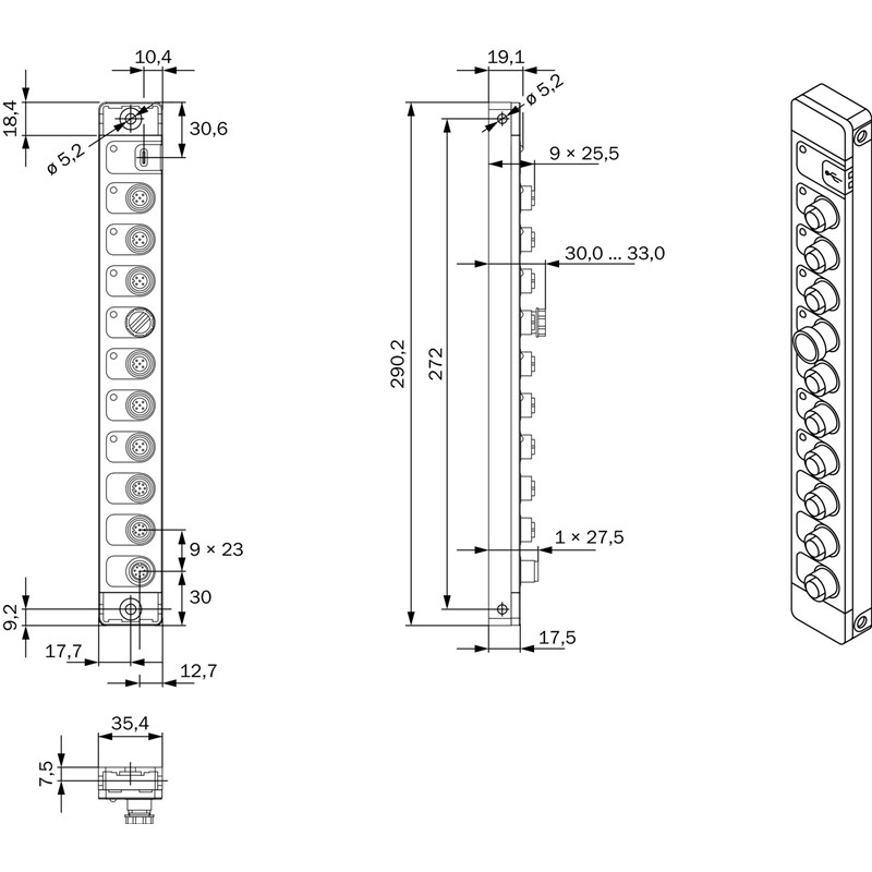 • Dimensions (l x H x P): 35,4 mm x 290,2 mm x 33 mm