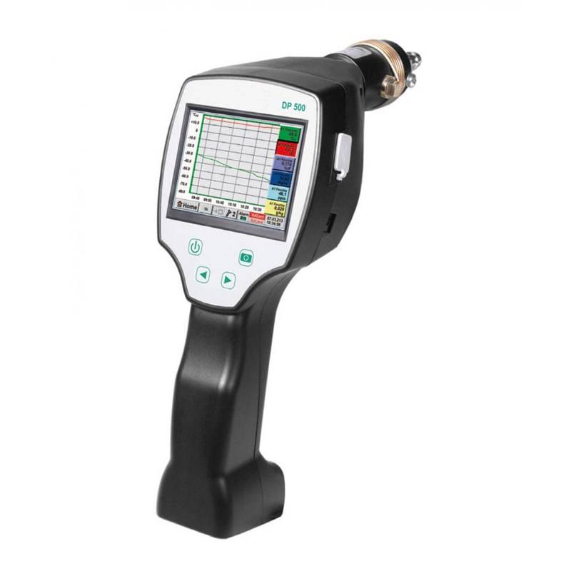 Instrument de mesure portable pour la mesure du point de rosée, de l'humidité relative et de la température dans l'air et les gaz neutres. Type DP500. Pression d'utilisation de - 1 à 50 bars. Boîtier ABS, afficheur couleur et tactile, enregistrement des données (2GB). Interface USB pour visualisation des données sur logiciel CS-SOFT-BASIC (Option). Sonde avec filetage 1/2 ", gamme Point de Rosée : -80 +50 °Ctd. Livré chambre de dessication, chambre de mesure standard jusqu'à 16 bars pour air comprimé, connecteur pneumatique rapide avec câble 1m, chargeur, accus, solution saline de contrôle à 11,3 HR%, mallette de transport et certificat d'étalonnage.