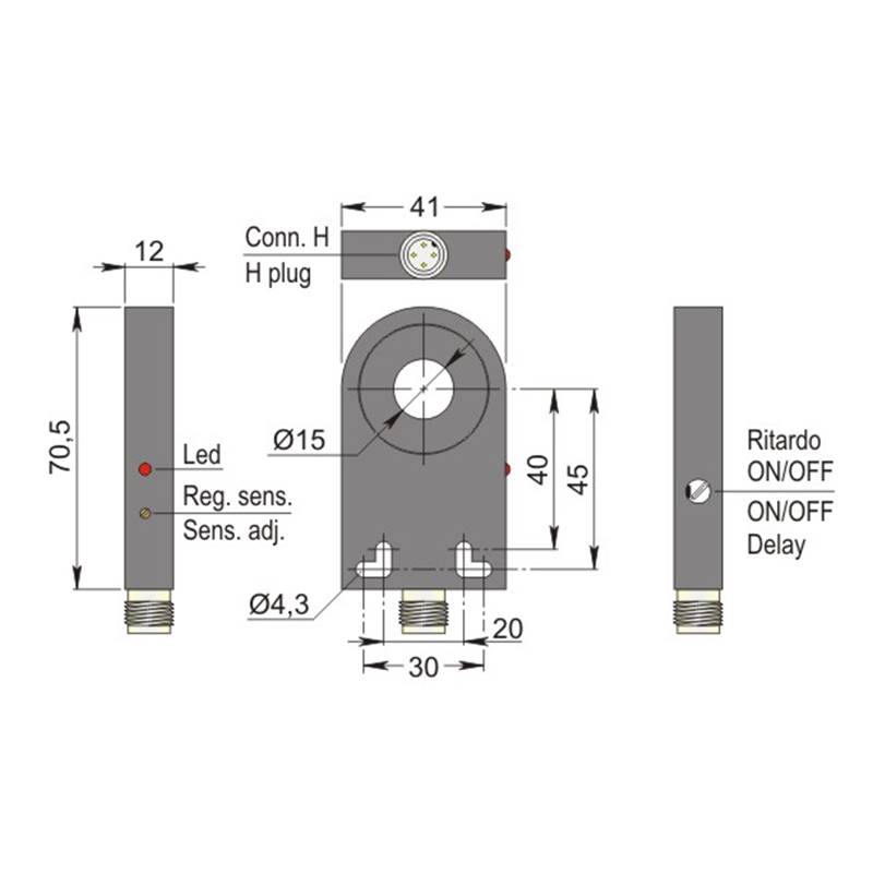 Détecteur inductif annulaire; Format: Annulaire; Version électrique: 4 fils DC; Diamètre de passage: Ø= 15mm; Objet minimum détectable: Ø 1.2 x 2 mm; Sortie de commutation: PNP; Type de commutation: Antivalente (NO+NF); Interface de communication: -; Raccordement: Câble 2 m, PVC; Tension d'alimentation: 10-30Vdc; Dimensions: 41 x 70.5 x 12 mm; Materiau du boîtier: Plastique; Température de fonctionnement: -20 ... +60 °C