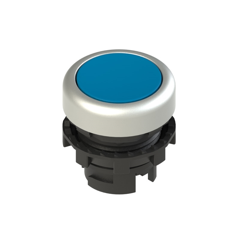 Bouton-poussoir lumineux affleurant; Bague de fixation et anneau façonné: Bague en plastique (standard); Fonction: Á impulsion; Forme: Affleurant Ø 20 mm; Couleur: Bleu; Collerette: Chromé satiné; Marquage du bouton: Pas de marquage; Degré de protection: IP67 selon EN 60529 et IP69K selon ISO 20653; Température ambiante: -25°C ... +80°C (standard); Série: EROUND