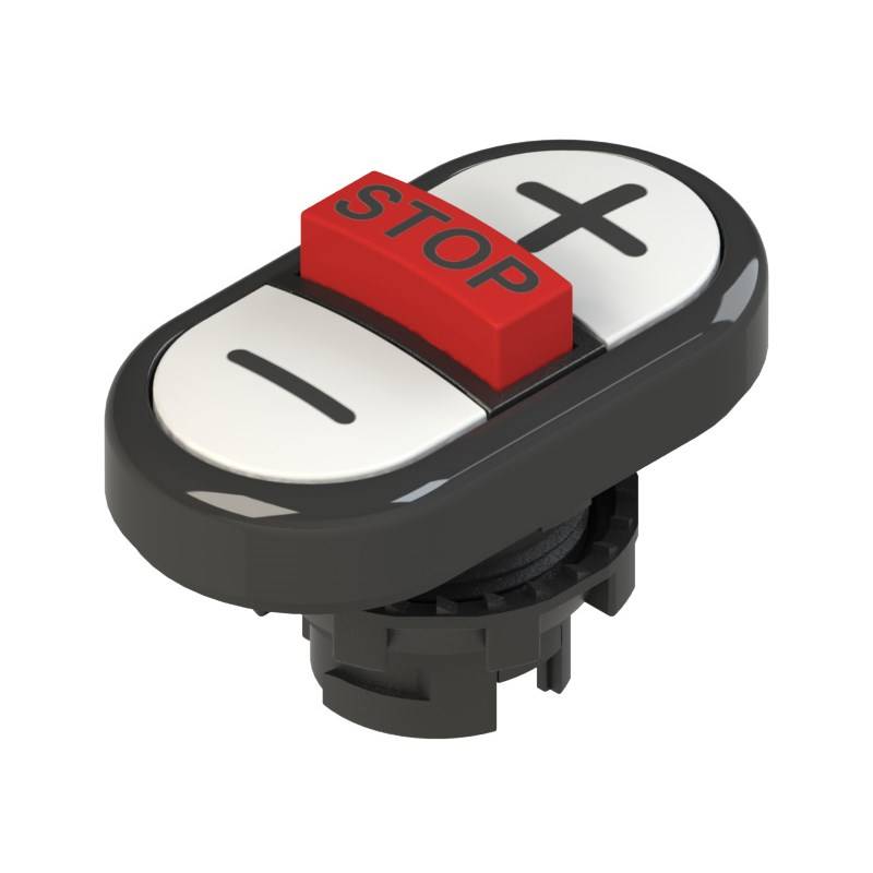 Bouton-poussoir triple, inférieur affleurant, avec marquage; Forme: Supérieur affleurant, inférieur affleurant; Élément intermédiaire: Bouton-poussoir dépassant; Collerette: Noir; Degré de protection: IP67 selon IEC 60529; Température ambiante: -25°C ... +85°C (standard)Couleurs et symboles:; Bouton-poussoir supérieur: blanc « + »; Bouchon central: rouge "STOP"; Bouton-poussoir inférieur: blanc « - »; Série: EROUND