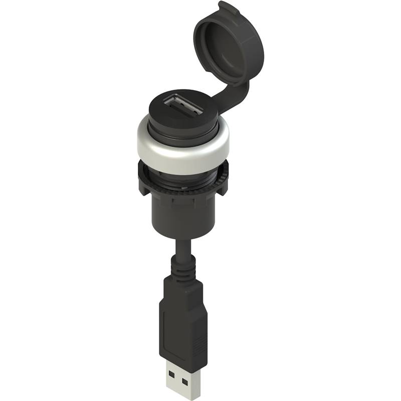 Prise USB 2.0; Collerette: Chromé; Connexion frontale: prise USB 2.0 type A femelle intégrée; Connexion arrière: sortie avec câble en PVC (longueur 0,8m) et connecteur USB type A mâle; Degré de protection: IP67; Série: EROUND