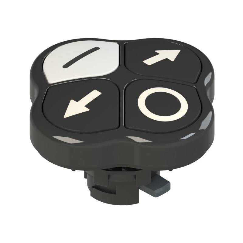 Bouton-poussoir quadruple; Bague de fixation: Bague en métal; Forme:- Bouton-poussoir supérieur affleurant, noir, flèche vers le haut- Bouton-poussoir droit affleurant, noir, flèche vers la droite- Bouton-poussoir inférieur affleurant, flèche vers le bas- Bouton-poussoir gauche affleurant, flèche vers la gauche; Collerette: Noir; Degré de protection: IP67
