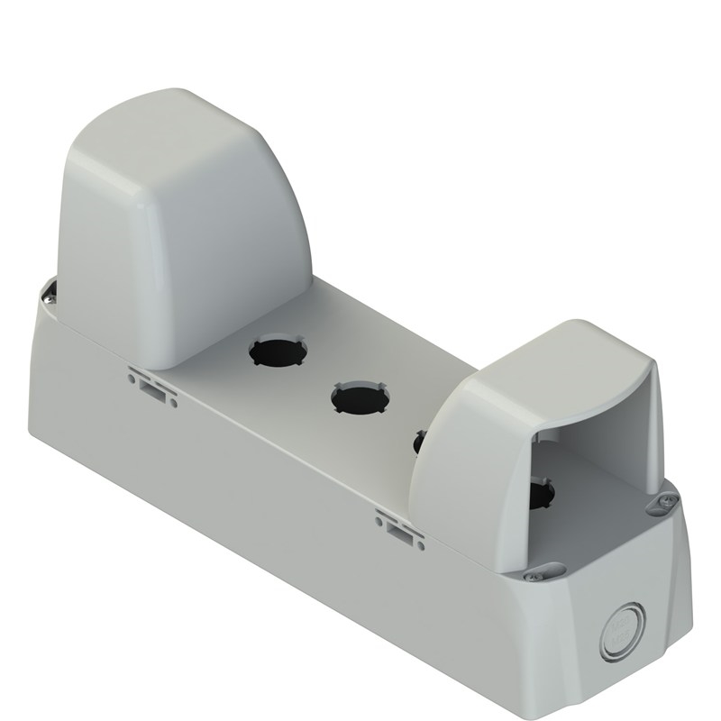 Boîtes pour le secteur d’automation avec protections pour commande bimanuelle; Boîtier: Boîtier en technopolymère; Dimensions du boîtier: 280 x 90 mm; Degré de protection: IP65 selon IEC 60529; Vis imperdables en acier inox; 2 entrées câble latérales + 2 entrées câble inférieures; Température ambiante: -40°C ... +80°C; Couleur: gris RAL 7035; Trou, Ø 22 mm: 5