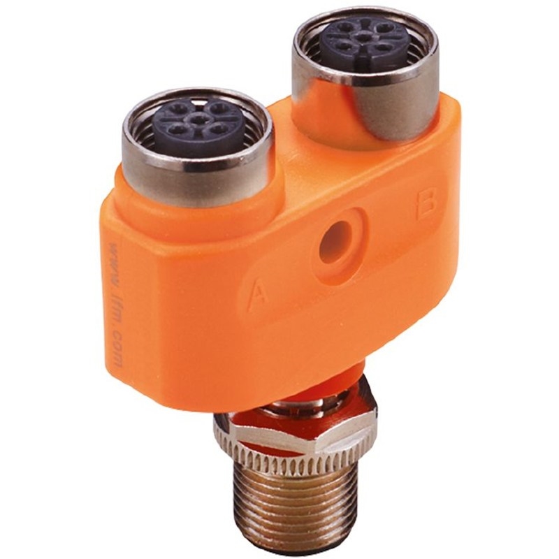 Connecteur / Câble de raccordement; Type : Répartiteur en Y; Raccordement A: Connecteur M12, femelle, 5 pôles, codé-A; Raccordement B: Connecteur M12, femelle, 5 pôles, codé-A; Raccordement C: Connecteur M12, mâle, 5 pôles, codé-A; Matières boîtier: PA orange; Matière écrou moleté: Laiton, nickelé; Tension d'alimentation: < 60 V AC; Courant de sortie total: 4 A; Indice de protection: IP65, IP67, IP68, IP69K; Température ambiante: -25...90°C