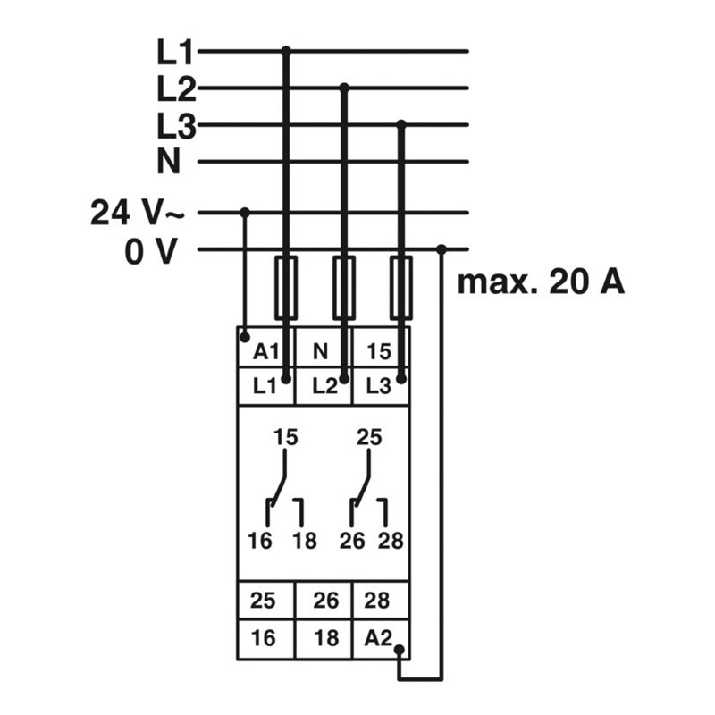 Relais de surveillance pour le contrôle des tensions triphasées de 280 à 520 V AC, sous-tension, fenêtre, séquence de phase, défaillance de phase, asymétrie, 2 inverseurs