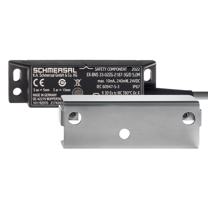 Capteur de sécurité magnétique pour zones explosives; Version: Avec voyant lumineux LED, Contacts câblés individuellement; Nombre de contacts NF: 2; Nombre de contacts NO: 1; Contact: Reed; Raccordement: Câble 5 m, PVC; Dimensions: 88 mm x 25 mm x 13 mm; Matériau du boîtier: Plastique, thermoplastique renforcé de fibres de verre; Etanchéité: IP67; Température ambiante: -25 °C ... +70 °C; Zones Ex: Zone 22 et 2; Catégorie: 3D, 3G; Etiquetage protection antidéflagrante: - D II 3G Ex nC IIC T6 Gc X, - D II 3D Ex tc IIIC T80°C Dc X; Actionneurs recommandés: EX-BPS 33-3G/D; Série: EX-BNS 33
