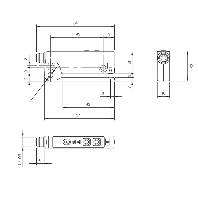 Fourche optique; Format: Fourche en U; Principe du capteur: Barrière simple; Écartement de la fourche: 3 mm; Profondeur de la fourche: 42 mm; Objet minimum détectable: 2 mm; Réglage: Teach-in; Source d'émission: LED, Lumière infrarouge; Sortie de commutation: PNP/NPN; Mode de commutation: Commutation claire/sombre; Temps de réponse: 50 µs; Fréquence de communication: 10kHz; Raccordement: Connecteur mâle M8, 4 pôles; Tension d'alimentation: 12-24Vdc; Dimensions: 64 mm x 25 mm x 10 mm; Matériau du boîtier: PA; Indice de protection: IP65; Température de fonctionnement: - 20°C…+ 60°C; Homologations: CE, UL; Série: FC7