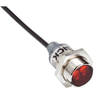 Capteur photoélectrique; Format: Cylindrique fileté, M18 x 1, faisceau axial; Principe du capteur: Détecteur à réflexion directe; Principe de détection: Énergétique; Distance de commutation max.: 5 mm ... 550 mm; Réglage: Potentiomètre, 270°; Source d'émission: LED PinPoint, Lumière rouge visible; Taille du spot lumineux (distance): Ø 9 mm (400 mm); Sortie de commutation: NPN; Mode de commutation: Commutation claire; Fréquence de commutation: 500 Hz; Raccordement: Câble, 3 fils, 2 m, PVC; Tension d'alimentation: 10-30Vdc; Dimensions: Ø 18 mm x 38,1 mm; Matériau du boîtier: Métal, Laiton nickelé et ABS; Indice de protection: IP67; Température de fonctionnement: –25 °C ... +55 °C; Compris dans la livraison: Écrou de fixation (2 x); Série: GR18S