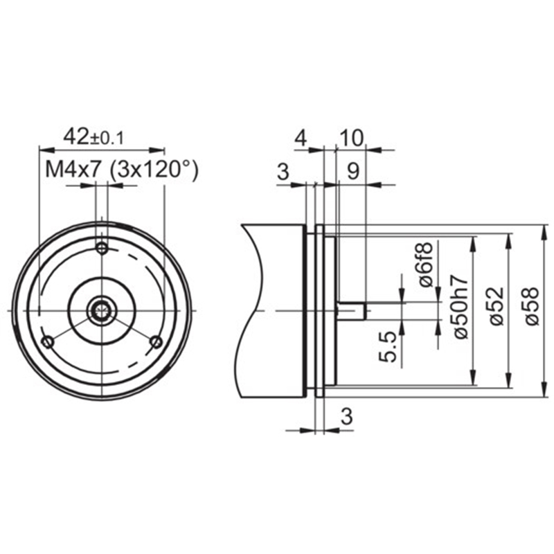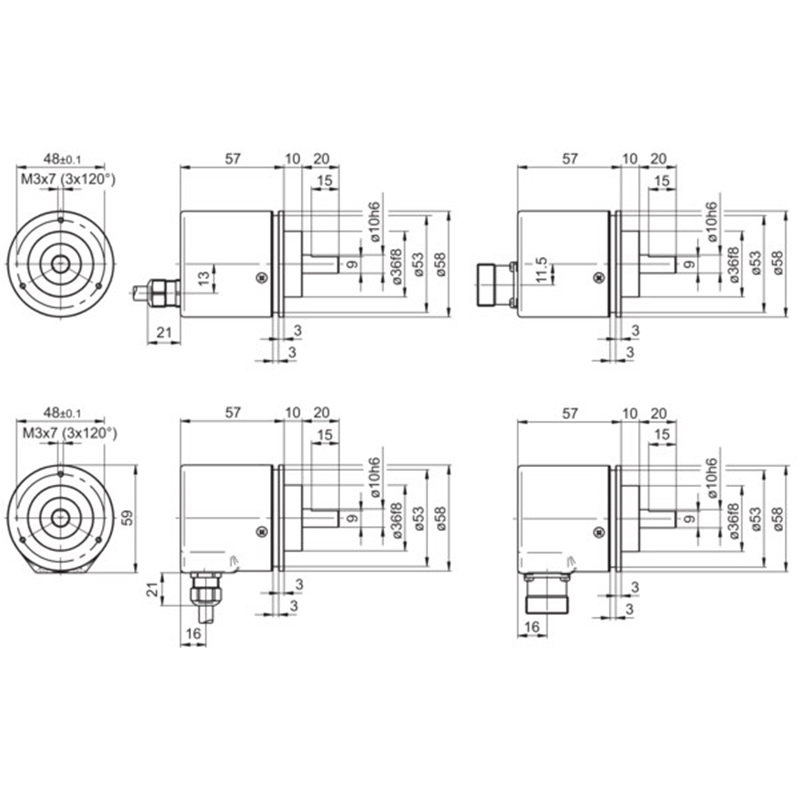 Codeur absolu réseau RS485 avec protocole ASCII, multitour, Ø58 mm à bride synchro et axe Ø6 mm, IP54, résolution 25 bits: ST 13 bits et MT 12 bits, alimentation 10-30 VDC, embase radiale mâle M23 à 12 contacts en sens horaire