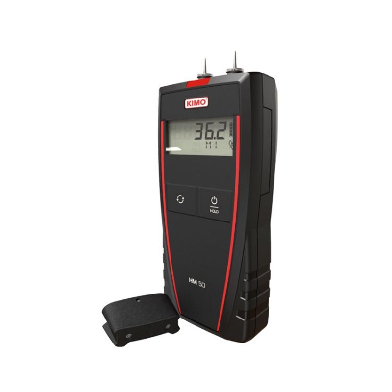 Humidimètre portable à pointes électronique type HM 50 pour matériaux : bois, béton, plâtre et brique. Afficheur 1 ligne. Fonctions : Choix des matériaux et Hold. Livré avec pointes interchangeables en inox longueur 10 mm, jeu de pointes de rechange, capot de protection, sacoche de transport et certificat d'ajustage