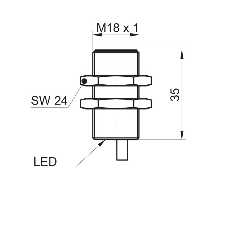 Détecteur de proximité inductif; Format: Cylindrique fileté, M18 x 1; Version électrique: 3 fils DC; Distance de commutation Sn: 8 mm; Montage: Quasi noyé; Sortie de commutation: PNP; Type de commutation: Contact à ouverture (NF); Fréquence de commutation: < 500 Hz; Raccordement: Câble 5 m, PVC; Tension d'alimentation: 10-30Vdc; Dimensions: Ø 18 x 45 mm; Matériau du boîtier: Laiton nickelé; Matériau (face active): PBT; Indice de protection: IP67; Température de fonctionnement: -25 ... +75 °C