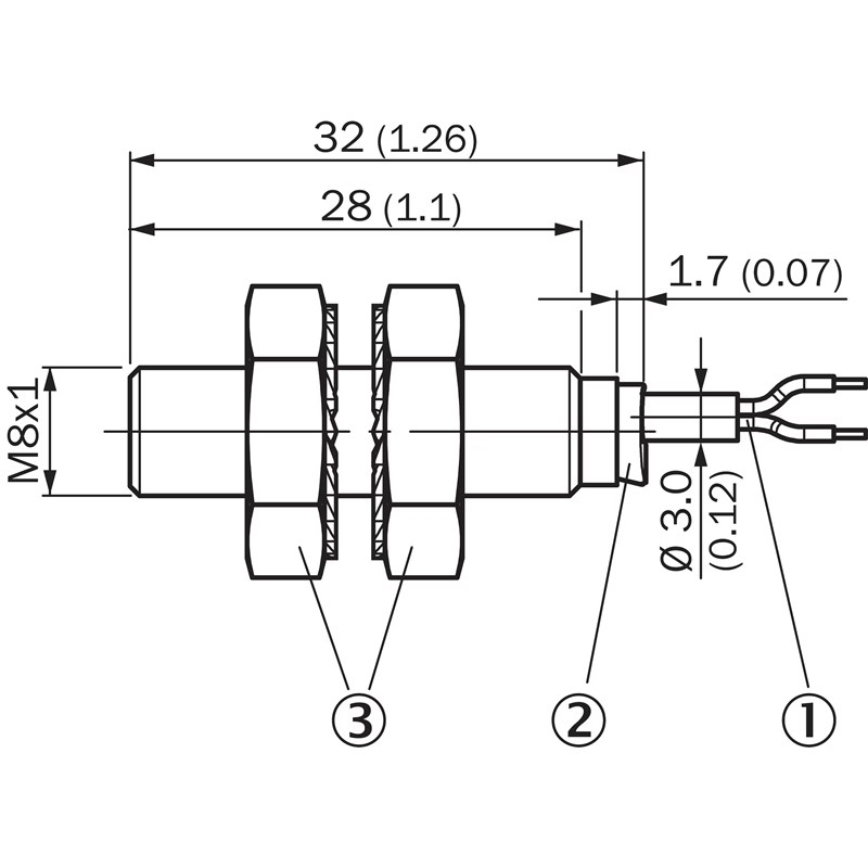 Détecteur de proximité inductif; Version électrique: 3 fils DC; Distance de commutation Sn: 1,5 mm; Montage: Noyable; Sortie de commutation: PNP; Type de commutation: Contact à fermeture (NO); Fréquence de commutation: 4.000 Hz; Raccordement: Câble, 3 fils, 3 m, PUR; Tension d'alimentation: 10-30Vdc; Diamètre: Ø 8 mm; Longueur totale du boîtier: 32 mm; Longueur de filetage utile: 28 mm; Matériau du boîtier: Acier inoxydable V2A, DIN 1.4305 / AISI 303; Matériau, surface active: Plastique, LCP; Indice de protection: IP68 (EN 60529), IP69K (ISO 20653:2013-03); Température de fonctionnement: –40 °C ... +100 °C; Caractéristiques spécifiques: Résistant aux réfrigérants et aux lubrifiants, ; Applications spéciales: Zone de réfrigérants et de lubrifiants, Engins mobiles, Conditions d'utilisation difficiles; Version spéciale: Avec conducteur manchonné sans collerette en plastique; Contenu de la livraison: Écrou de fixation, acier inoxydable V2A avec denture de blocage (2 x); Série: IMB