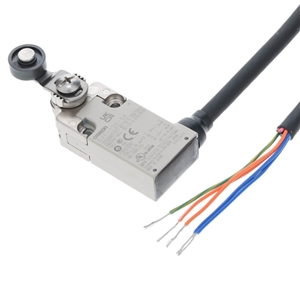 Fin de course miniature, métal, ouverture forcée, 1NF/1NO, levier métal à galet plastique, câble 1 m vertical