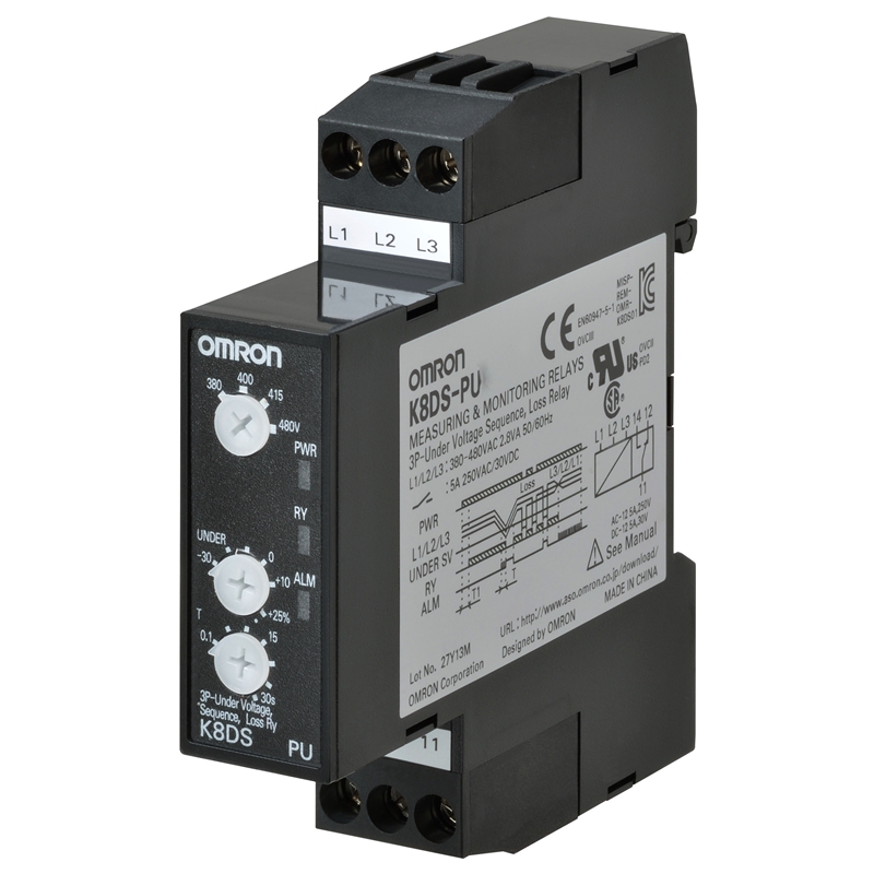 Le K8DS-PU est le relais de contrôle triphasé simplifié à circuits 3 fils avec une carte. Il peut surveiller les sous-tensions, la séquence de phase et la perte de phase.