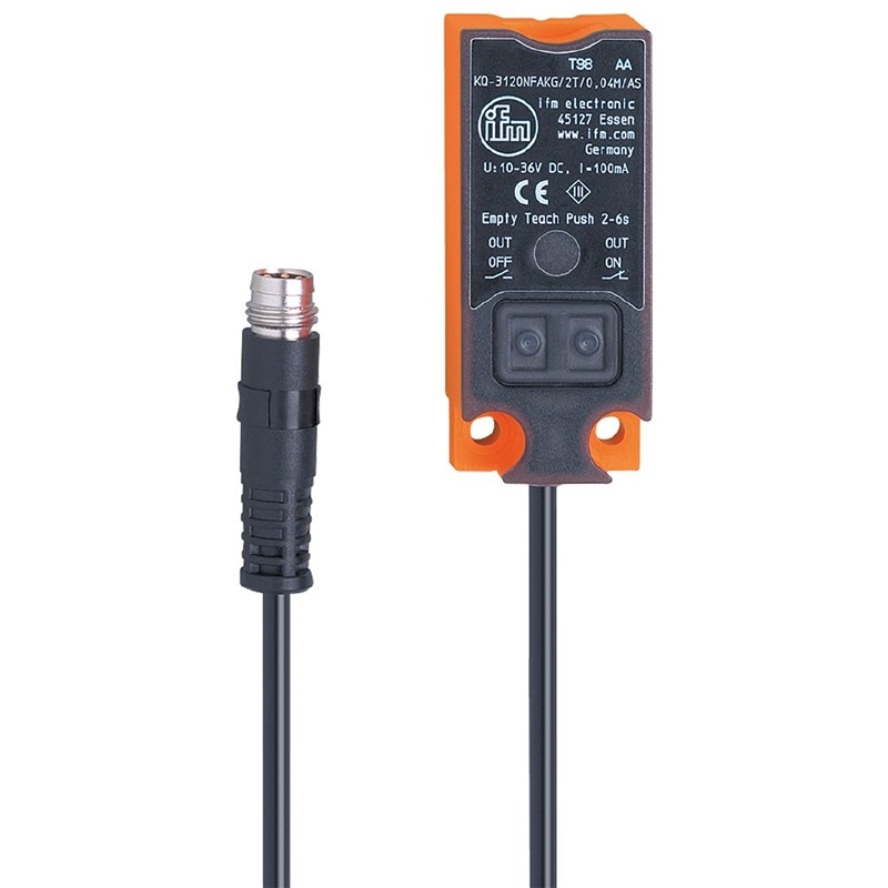 Détecteur capacitif; Format: Parallélépipédique; Version électrique: 3 fils DC; Portée: 12 mm; Montage: Non noyable; Sortie de commutation: PNP; Type de commutation: Contact à ouverture/fermeture (NO/NF); Fréquence de commutation: 10 Hz; Interface de communication: IO-Link V1.1, COM1 (4,8 kBaud); Raccordement: Câble avec connecteur M8, 4 pôles, 0.04 m, PVC; Tension d'alimentation: 10-30Vdc; Dimensions: 20 x 14 x 48 mm; Classe de protection: IP 65; IP 67; IP 69K; Température ambiante: -25...80 °C