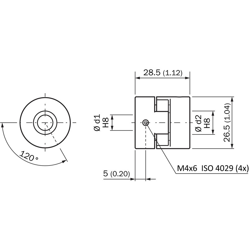Accouplement d'arbre; Accouplement à crabots, diamètre de l’axe 10 mm / 10 mm, élément d’amortissement 80 shore bleu, décalage d'axe maximum : radial ± 0,22 mm, axial ± 1 mm, angulaire ± 1,3°, vitesse max. 19.000 tpm, angle de torsion max. 10°, –30 °C à +80 °C, couple max. 800 Ncm ; couple de serrage des vis : ISO 4029 150 Ncm, matériau : bride en aluminium, élément d’amortissement : polyuréthane