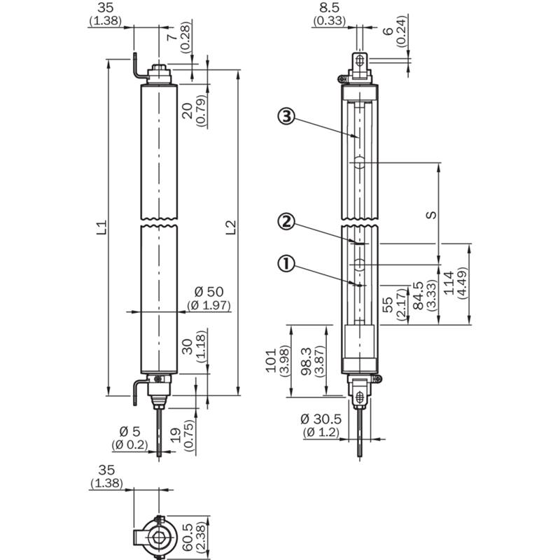 Barrière immatérielle de sécurité multifaisceaux; Catégorie: Catégorie 2 (ISO 13849); Architecture du système: Émetteur en boîtier de protection selon IP69K avec câble prémonté, 15 m; Portée: 0,5 m ... 15,5 m; Nombre de faisceaux: 3; Entraxe des faisceaux: 400 mm; Raccordement du système: 5 pôles, Extrémité de câble libre; Diamètre du boîtier: 50 mm; Indice de protection: IP65, IP66, IP67 (CEI 60529), IP69K (ISO 20653); Température de service: –30 °C ... +55 °C; Série: deTem2 Core IP69K