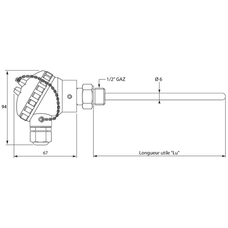 Sonde PT100 avec tête miniature avec raccord et transmetteur; Gaine de protection Inox 316L Ø6x0,4; Longueur utile 200 mm; Sonde PT100 CEI 60751 classe A simple enroulement en montage 3 fils; Tête de raccordement type MDANG (IP68) avec chaînette sur couvercle à visser et presse-étoupe polyamide IP68; Raccord: 1/2" GAZ cylindrique mâle en acier inox 316 L; Température d’utilisation: -50 à +50°C; Montage anti-vibratoire; Sortie 4-20 mA type 940PRO