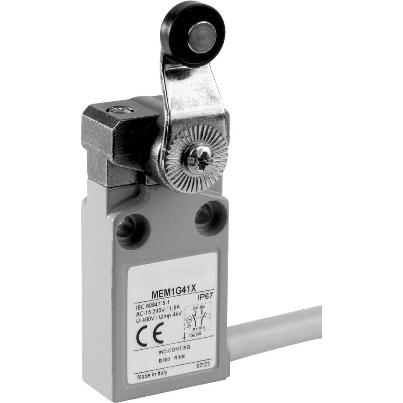 Interrupteur de fin de course MAC-I, série MEM, à levier avec poulie métallique, boîtier métallique, IP67, pré-câblé, câble de 1 m, 1NO + 1NF